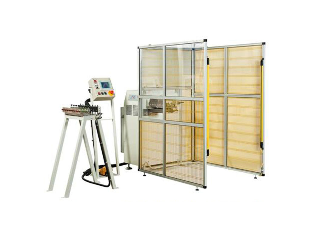 Macchina bobinatrice costruita con telaio portante in tubolare e pannelli di acciaio verniciato. Adatta alla preparazione di matasse di filo di rame.